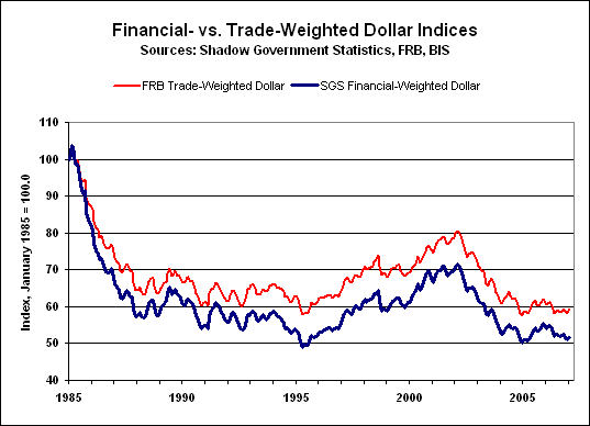 [Note: Historical data on both dollar series are available for download on the Alternate Data page of www.shadowstats.com. See the July 2005 SGS for methodology.]