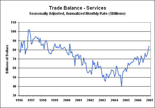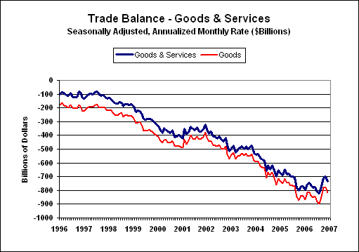 Reported Annual Trade Deficit at Record. Unfortunately, the quality of reporting for the U.S. trade deficit is of increasingly suspect quality. The December report included the annual numbers for 2006, where the total deficit for goods and services hit a record $763.6 billion, up from $716.7 billion in 2005 and $611.3 billion in 2004. Of the 2006 total, a goods deficit of $836.1 billion partially was offset by a $72.5 billion surplus in services.