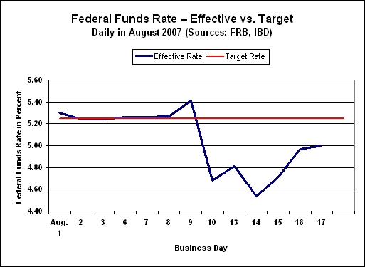 Bank Runs and Commercial Paper Woes Shake the Fed. The Fed issued two statements on Friday (August 17th). First, was the announced cut from 6.25% to 5.75% for the discount rate cut, which is the interest rate charged by the central bank to troubled banks borrowing at the discount window. The "temporary changes" to the Fed's primary credit discount window facility also included "term financing for as long as 30 days, renewable by the borrower" -- versus the usual overnight lending -- and an emphasis on the "broad range of collateral for discount window loans, including home mortgages and related assets."