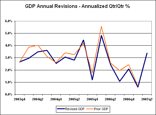Gross Domestic Product (GDP) -- The "advance" estimate of annualized real (inflation-adjusted) growth for the second quarter of 2007 was 3.38% +/- 3%, matching consensus forecasts (the Bureau of Economic Analysis has been known to target consensus forecasts with its advance guesstimate), but well beyond credibility for this most politicized of economic series. The second quarter's gain rebounded from 0.60% in the first quarter, while year-to-year growth jumped to 1.78% in the second quarter, up from 1.55% in the first.