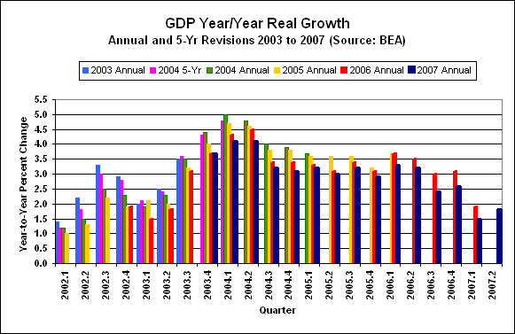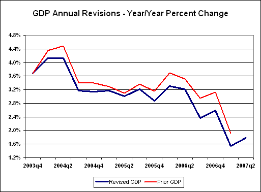 The current annual revision only starts with first-quarter 2004. The revision patterns suggest downside surprises await the period of GDP growth during the now almost defunct 2000 recession. Those revisions have to wait for the five-year benchmark revisions, when the base inflation year is revised. At that time, all the accounts will be updated back to 1929. The next such revision is scheduled for 2009, when the base inflation adjustment year will be changed from 2000 to 2005. At that time, the 2000 recession should be recognized as having been much longer and deeper than previously reported. Full reporting of the current downturn may wait until 2014 or 2019, at which point newly reported quarterly contractions in 2006 and 2007 would be considered ancient history.