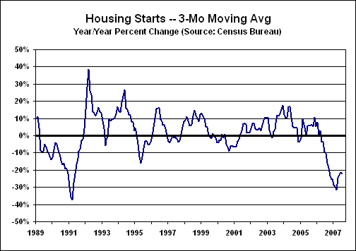 As shown in the graph of the three-month moving average of annual change in housing starts, the recent decline in starts remains the weakest since the 1990/1991 recession.