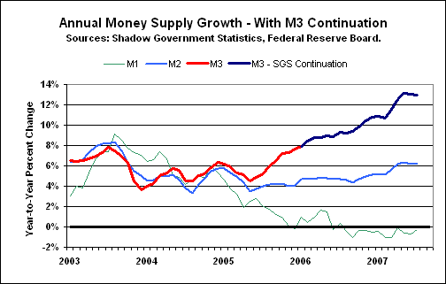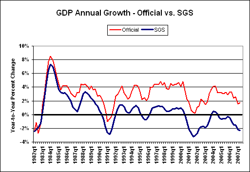 Nonetheless, current and historical reported U.S. economic growth rates of recent years still remain heavily overstated, due largely to methodological "innovations" that have generated these and other upside biases in the official series. The Shadow Government Statistics Alternate GDP measure continues to approximate historical annual GDP with those biases removed (see the "Alternate Realities" section and Alternate Data Series tab at www.shadowstats.com for the latest plot and data, and the August 2006 SGS Newsletter for methodology). Given that the official 2007 annual revisions were in the normal scope of the previous SGS analysis, the SGS alternate growth estimates are unrevised.