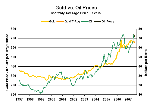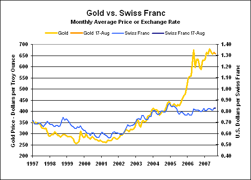 The updated gold versus oil and Swiss franc graphs show July averages as well as added points for closing prices on August 17th. As we go to press, gold is trading around $658, oil is around $72 and the Swiss franc is around $0.83. Look for all three measures to trade significantly higher in the months ahead.