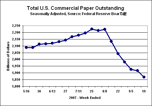 That the liquidity crisis continues can be seen in the following graph of weekly commercial paper outstanding. After a week's slower pace of collapse, the week ended September 19th showed a resumption of the ongoing pace of collapse that helped to trigger the first discount rate cut back on August 17th.