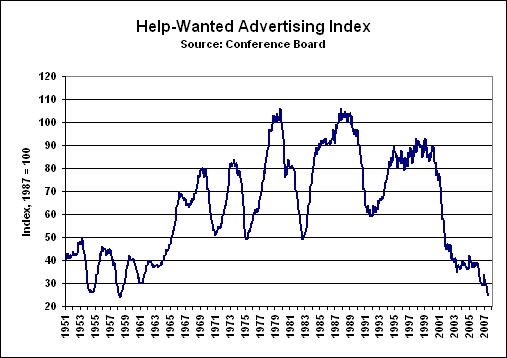 Help-Wanted Advertising Index (HWA) -- As discussed and graphed in this month's Opening Comments, the Conference Board reported that help-wanted advertising plunged still again, to 25 in July, from 26 in June and down from 27 in May, down from 29 in April, down from 34 in December, hitting its lowest level since 1958. Even allowing for the advertising volume lost to the Internet in recent years, the current weakness is severe enough to signal a deepening problem in the employment sector. The July number was down 19.4% from the year before, versus an 18.8% annual contraction June.