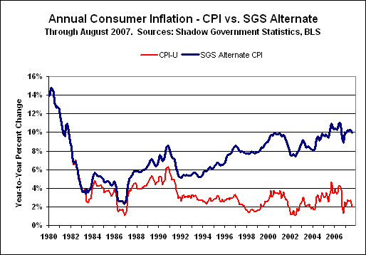 Alternate Realities. General background note: This section updates the Shadow Government Statistics (SGS) alternate measures of official CPI and GDP reporting. When a government economic measure does not match common public experience, it has little use outside of academia or the spin-doctoring rooms of the Federal Reserve, White House and Wall Street. In these alternate measures, the effects of gimmicked methodological changes have been removed from the official series so as to reflect more accurately the common public experience, as embodied by the post-World War II CPI and the pre-Reagan-Era GDP. The methodologies for the series are discussed in the August 2006 SGS (see Archives page at www.shadowstats.com).