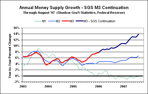 Money Supply -- The SGS Ongoing M3 estimate of annual growth for the August average surged to 14.0% from 13.0% in July. The increase reflects liquidity crisis factors as discussed in this month's Opening Comments. The current pace of growth has disturbing inflationary implications.