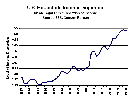 As shown in the following graph, income dispersion remains at an historic high, well beyond any level seen before the onset of the Great Depression. The mean logarithmic deviation of income actually declined to 0.543 in 2006 from 0.545 in 2005, but such is a statistically meaningless difference.