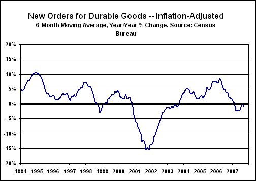 New Orders for Durable Goods -- For September, the usually volatile durable goods orders fell by 1.7% (down by 2.3% net of revisions), seasonally adjusted, after having fallen by 5.3% in August (previously a 4.9% monthly drop). On an annual basis, durable goods orders declined by 8.4%, showing an ongoing pattern common for this series during recessions. As discussed and graphed in this month's Opening Comments, the year-to-year change in the inflation-adjusted, six-month moving average of the series is in contraction.