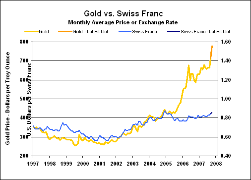 The updated gold versus oil and Swiss franc graphs show September averages as well as added points for closing prices on October 26th. As of Friday's closing prices, gold was at $779.15, oil at $91.87 and the Swiss franc at $0.86. All three measures should trade significantly higher in the months ahead.