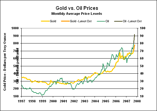 As of Friday, October 26th, West Texas Intermediate closed at another all-time high of $91.87. Price movement remains highly volatile, but broadly is trending higher, and should continue setting new daily record highs, with $100 oil being widely touted in the market place. Even current levels, however, are an absolute disaster for pending U.S. inflation. Regardless of any near-term price swings, meaningful upside risks to oil prices remain in place, both from the intensifying dollar weakness and related OPEC rumblings, and from ever-volatile Middle Eastern political tensions.