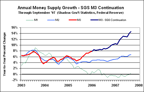 Money Supply -- The SGS Ongoing M3 estimate of annual growth for September showed annual growth at 14.7%, up from 13.9% in August. The September growth rate is the highest since November 1971, two months after Richard Nixon closed the gold window. The current pace of growth has disturbing inflationary implications.
