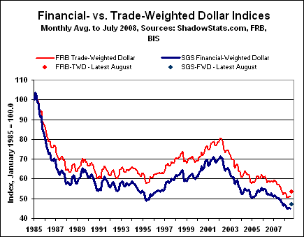U.S. Dollar Indices. The Shadow Government Statistics’ Financial-Weighted U.S. Dollar Index (FWD) is based on dollar exchange rates weighted for respective global currency trading volumes. For July 2008 the monthly FWD fell by 0.90%, after gaining 0.45% in June. The July 2008 average index level of 44.92 (base month of January 1985 = 100.00) was down by 8.80% from July 2007, while June 2008 was down 9.84% from the year before. As of August 8th, the FWD had rebounded to 47.05.