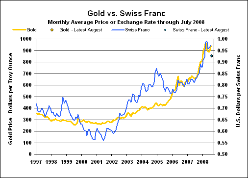 The updated gold versus oil and Swiss franc graphs and the new gold versus silver graph show the July monthly average price levels, as well as added points for closing prices on August 8th, with gold at $852.50, silver at $15.76, oil at $115.20 and the Fed’s published noon buying rate for the Swiss franc at $0.9258. All four measures should trade significantly higher in the months ahead, eventually breaking highs seen otherwise during the last six months.