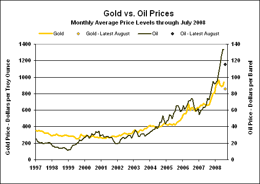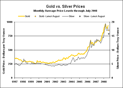 For July (based on Kitco.com), the monthly average London gold afternoon fix was $939.77 per troy ounce, versus $889.49 in June. Silver averaged $18.03 per troy ounce in July, up from $16.97 in June. Respective closing prices on August 8th were $852.50 and $15.76 per troy ounce.