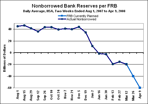 As shown in the accompanying graph, nonborrowed bank reserves had dropped to roughly a negative $20 billion as of the last reporting. Assuming that total bank reserves hold in the low $40 billion range over the next several weeks, nonborrowed bank reserves would drop to roughly a negative $60 billion by April 9th, given the currently announced size of the TAF auctions. Such reflects neither the $100 billion term repos, nor the $200 billion in TSLF lending, which are not counted as borrowed reserves.