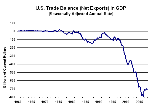 The U.S. trade deficit has been in a downhill spiral since the mid-1990s, but it reportedly improved on an annual basis for 2007, per the Bureau of Economic Analysis (BEA) and the Census Bureau (Census), which share reporting of this key series. Based on the revisions included in the reporting of the January trade deficit, the 2007 deficit in goods and services narrowed to $708.5 billion from a record $758.5 billion in 2006. Such broke out as the merchandise trade deficit narrowing to $815.4 billion in 2007, from $838.3 billion in 2006, and the services sector showing a $106.9 billion surplus in 2007, up from $79.7 billion in 2006. This reporting is of extremely poor quality, but it has helped spike growth in recent GDP reporting. The deficit is reflected in the net exports account, where the trade shortfall is subtracted from GDP. Hence, a narrowing of the deficit adds to reported GDP growth.