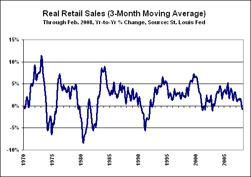 Retail Sales — As discussed and graphed in the Opening Comments, real (inflation-adjusted) retail sales is confirming a recession in place, with the year-to-year real change in the three-month moving average version of the series turning negative.