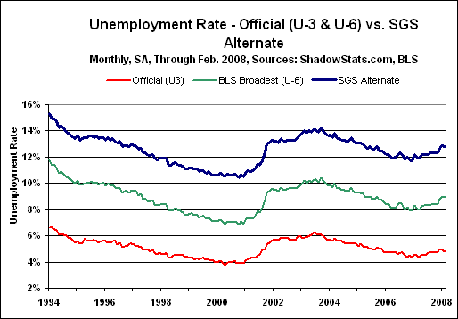 The February 2008 seasonally-adjusted U.3 unemployment rate showed a statistically insignificant decline to 4.81% +/- 0.23% from 4.93% in January. Unadjusted, U.3 narrowed to 5.2% in February from 5.4% in January. The broader U.6 unemployment rate eased to an adjusted 8.9% (9.5% unadjusted) in February from 9.0% (9.9% unadjusted) in January. Adjusted for the "discouraged workers" defined away during the Clinton Administration, actual unemployment is running about 12.8%, as shown in the SGS-Alternate Unemployment Measure, introduced in this month’s Alternate Realities section.