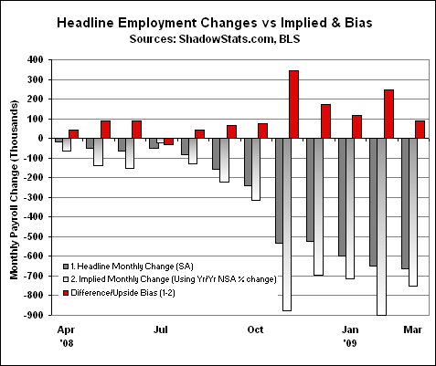 Concurrent Seasonal Factor Bias. The pattern of impossible biases being built into the headline monthly payroll employment continued with March 2009 reporting (see the opening section above and the Reporting/Market Focus in SGS Newsletter No. 43 of June 10, 2008). Instead of the headline jobs loss of 663,000, consistent application of seasonal-adjustment factors — net of what I call the concurrent seasonal factor bias — would have shown a more-severe monthly jobs loss of about 750,000. This upside reporting bias has been seen in 11 of the last 12 months, with a rolling 12-month total upside headline-number bias of 1,345,000. A worksheet on this is available upon request.