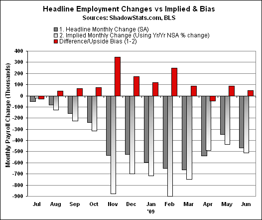 Concurrent Seasonal Factor Bias. The pattern of impossible biases being built into the headline monthly payroll employment continued, with an upside bias of 46,000 jobs in June 2009 reporting (see the accompanying graph). Instead of the headline jobs loss of 467,000, consistent application of seasonal-adjustment factors — net of what I call the concurrent seasonal factor bias (CSFB) — would have shown a more-severe monthly jobs loss of about 513,000. This pattern has generated an upside reporting bias seen in 10 of the last 12 months, with a rolling 12-month total upside headline-number bias of 1,210,000. A worksheet on this is available upon request. (See SGS Newsletter No. 50, for further background.)