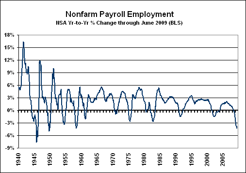 The unadjusted annual decline in June payrolls was the deepest since a similar decline at the trough of the 1958 recession, but still shy of the 4.9% trough seen in the 1949 downturn. When the 1949 annual low growth is broken, possibly next month, the annual percentage contraction in payrolls will be the most severe since the production shutdown following World War II (see the accompanying graph).