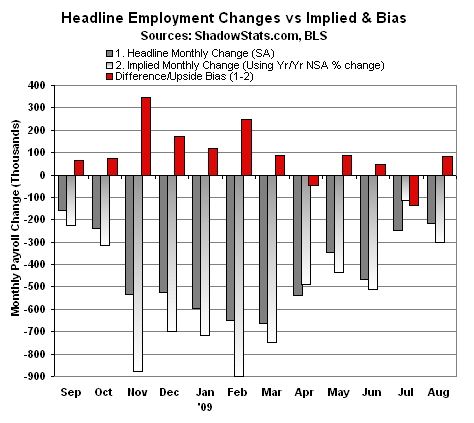 - Concurrent Seasonal Factor Bias. The pattern of impossible biases being built into the headline monthly payroll employment resumed, following a one-month reversal, with an upside bias of 84,000 jobs in August 2009 reporting. Instead of the headline jobs loss of 216,000, consistent application of seasonal-adjustment factors — net of what I call the concurrent seasonal factor bias (CSFB) — would have shown a more-severe monthly jobs loss of about 300,000. This factor has generated an upside reporting bias seen in 10 of the last 12 months, with a rolling 12-month total upside headline-number bias of 1,146,000. A worksheet on this is available upon request. (See SGS Newsletter No. 50, for further background.)