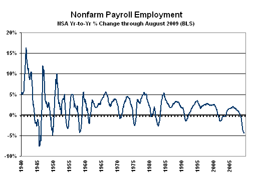The unadjusted 4.4% annual decline in August payrolls was the deepest since the 4.9% trough seen in the 1949 downturn. When the 1949 annual low growth is broken in the next couple of months, the annual percentage contraction in payrolls will be the most severe since the production shutdown following World War II. Disallowing that as a normal business cycle, the decline would be the worst since the Great Depression.
