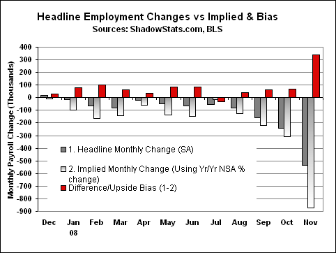Concurrent Seasonal Factor Bias. The pattern of impossible biases (see the Reporting/Market Focus in SGS Newsletter No. 43 of June 10, 2008) being built into the headline monthly payroll employment changes intensified sharply with November reporting. Instead of the headline jobs loss of 533,000, consistent application of seasonal-adjustment factors — net of what I call the concurrent seasonal adjustment bias — would have shown a more-severe monthly jobs loss of about 873,000. This upside reporting bias has been seen in 11 of the last 12 months, with a rolling 12-month total upside headline-number bias of 955,000.
