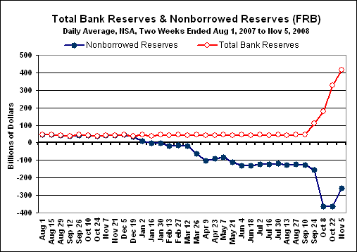 Reserves and Monetary Base Surge, Broad Money Measure Still Lags. As shown in the following graphs, total reserves of depository institutions (FRB, not seasonally adjusted) continued to surge, rising to $415.7 billion in the two weeks ended November 5th, from $327.6 billion in the prior two-week period, and from $44.2 billion as recently as September 10th.