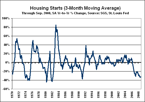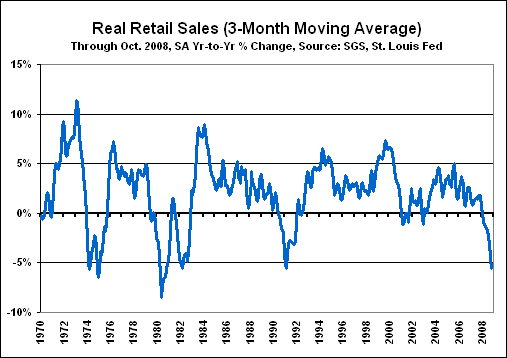The housing starts graph was adjusted to eliminate New York City paperwork distortions that artificially inflated June 2008 reporting. The retail sales graph includes October reporting, with an estimate of a seasonally adjusted 1.0% decline in the October CPI.