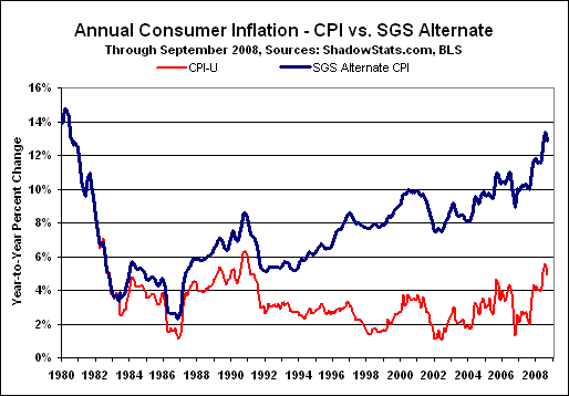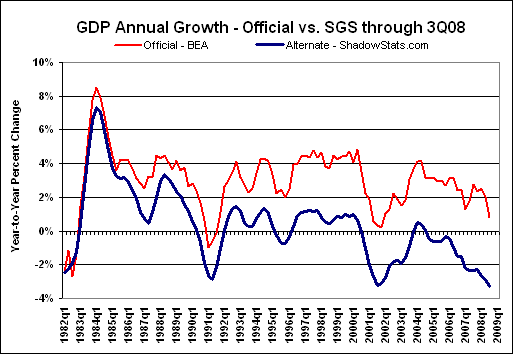 GDP. The alternate third-quarter 2008 GDP growth reflects the "advance" estimate, with many of the methodological gimmicks of recent decades removed. The alternate third-quarter inflation-adjusted annual growth rate (year-to-year, as opposed to the popularly-touted annualized quarter-to-quarter rate) for GDP was a decline of roughly 3.3% versus the official year-to-year gain of 0.8%. The official, annualized real quarter-to-quarter change stands at a 0.3% contraction. While the quarterly growth number is popularly followed, its significant inaccuracies are expanded to the fourth-power in reporting. The alternate measure safely would have shown an annualized quarterly contraction in the third quarter, likely in excess of two-percent.