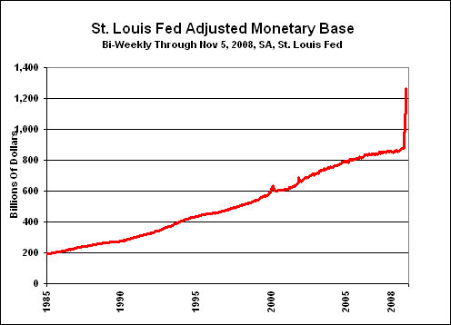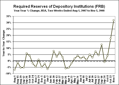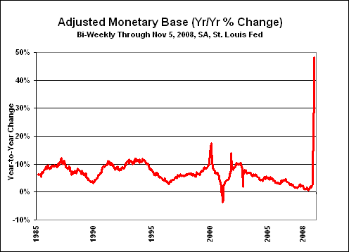 The seasonally-adjusted St. Louis Fed Monetary Base — the traditional tool for adjusting money supply growth — rose by 7.0% (annualizes to over 3200%) between the two-week periods ended October 22nd and November 5th. The monetary base basically includes the currency component of M1 and total bank reserves. Year-to-year growth for the latest two week period was 48.2%, up from 38.0% year-to-year in the prior period, due largely to surging reserves.