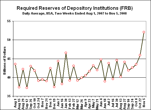 Where most of the growth has been in excess reserves, such suggests that the banks generally have not resumed normal lending. Of some significance, however, required reserves rose to $52.1 billion in the latest period, up from $45.9 billion in the prior period and from $41.9 billion in the two weeks ended September 10th. The 31.9% annual growth in required reserves is at the fastest pace of the post-World War II era. This suggests that the excess reserves have started entering the system, albeit slowly, even allowing for shifts in unreserved existing funds into accounts that have reserve requirements.