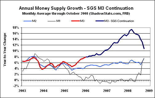 As discussed in the Money Supply Special Report of August 3, 2008, there is no perfect measure of money growth. Generally, the broader the measure (M3 being the broadest until discontinued by the Fed in 2006, still estimated by the SGS-Ongoing M3), the better it is as a predictor of inflation. Discontinued in 1998 by the Fed was a still-broader measure known as "L" for liquid assets. It contained individual holdings of Treasury bills. In the recent panic, the Treasury issued bills to help keep that market liquid, but that had the effect of drawing cash out of the system and out of the reported money supply. If "L" still were published, I estimate annual growth would have been about 15% in October.