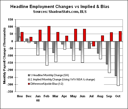 Concurrent Seasonal Factor Bias. The pattern of impossible biases (see the Reporting/Market Focus in SGS Newsletter No. 43 of June 10, 2008) being built into the headline payroll employment changes intensified with October reporting. Instead of the headline jobs loss of 240,000, consistent application of seasonal-adjustment factors — net of what we are calling the concurrent seasonal adjustment bias — would have shown a more-severe monthly jobs loss of about 308,000. This upside reporting bias has been seen in 11 of the last 12 months, with a rolling 12-month total upside headline-number bias of 678,000.
