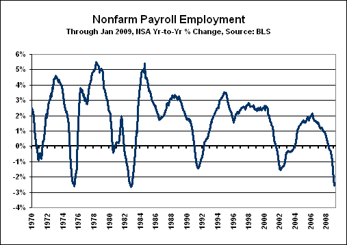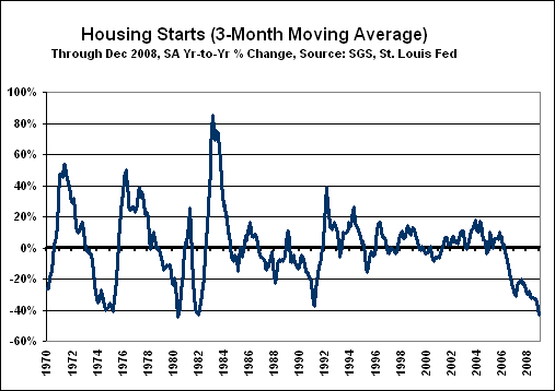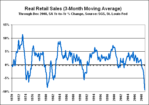 Economic Activity Continues to Sink, Despite Occasional Bottom-Bouncing. The broad economy pretty much continued in freefall in the latest round of economic reporting, in terms of annual pace of decline, although there was some bottom-bouncing in the monthly retail sales number for January. There may be other short-term monthly bottom-bouncing in series such as industrial production. What is at work here is the natural result of the bottom falling out of a market. Activity rarely falls to zero, but it often will bounce along a plateau of low-level activity, before plunging anew. In such circumstances, the year-to-year change usually continues to deepen or temporarily stalls at a low level.