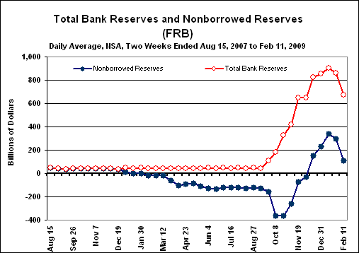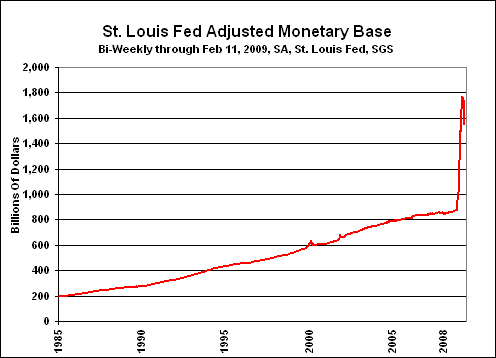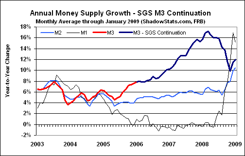 Although the depository system has been salvaged, at least temporarily, the banking system itself remains effectively insolvent, with both the Fed and the Treasury throwing around new trillion-dollar promises as though a trillion dollars is nothing anymore (it quickly would become so in a hyperinflation). Despite some signs of systemic stability, as evidenced by renewed growth in broad money supply, there also are possible signs again of increasing stress (see M3 comments that follow). The depths of the economic and systemic solvency crisis are so severe, the Fed and the Treasury likely are not going to be able to stabilize the banking system without eventual nationalization of at least some of the larger banks. However it unfolds, Messrs. Bernanke and Geithner will create and spend whatever money they have to in order to prevent a systemic collapse, and they will do so until such point as they may have destroyed the purchasing power of the U.S. dollar.