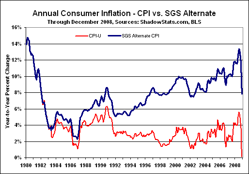 GDP. The alternate fourth-quarter 2008 GDP growth reflects the "advance" estimate, with many of the methodological gimmicks of recent decades removed. The alternate fourth-quarter inflation-adjusted annual growth rate (year-to-year, as opposed to the popularly-touted annualized quarter-to-quarter rate) for GDP was a decline of roughly 4.1% versus the official year-to-year contraction of 0.2%. The official, annualized real quarter-to-quarter change stands at a 3.8% contraction. While the quarterly growth number is popularly followed, its significant inaccuracies are expanded to the fourth-power in reporting. The alternate measure safely would have shown an annualized quarterly contraction in the fourth quarter of more than seven-percent.