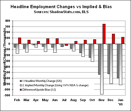 In 11 of the last 12 months, and in 20 of the last 22 months in which I have tracked this particular issue, applying the year-to-year change in unadjusted payroll numbers to the seasonally-adjusted payroll numbers has suggested that reality has been significantly weaker than indicated by the headline payroll numbers as reported by the BLS. The headline numbers are what drive the financial markets. Although the numbers are revised in the next two months of reporting, and in the annual benchmark revisions, the markets rarely take note of revisions, concentrating instead on the latest headline report.