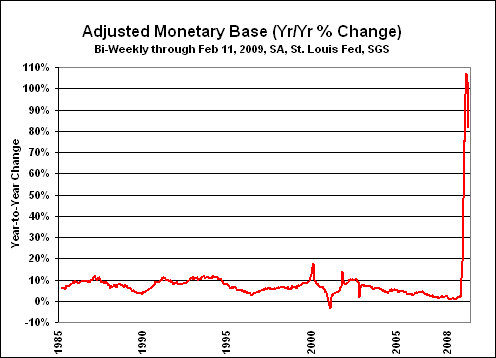 Yet, with some early suggestion of a possible renewed stall in the growth of the broader money measures, the systemic solvency crisis may be intensifying again, frustrating Fed efforts to get more cash into the system. Ahead lies an opportunity for the Fed, with heavy Treasury fundings needed to cover the stimulus package and an otherwise recession-driven deterioration in the federal government’s fiscal condition. With likely light foreign and domestic demand for the Treasury securities, Federal Reserve monetization of that debt would be a reasonably easy option for Mr. Bernanke to help reignite inflationary pressures. The Fed mentioned the possibility of such purchases in its most recent FOMC statement.