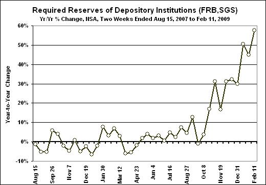 Of greater significance to the broader money measures, however, annual growth in required reserves (seasonally-unadjusted) surged to 57.7% in the latest two weeks, up from 45.0% in the prior period and versus 50.4% in the period before that. This record post-World War II annual growth suggests ongoing growth in depository accounts.