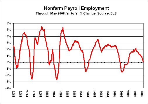 Recession Solidifies in Key Data. Official economic reporting in the last month or so has generated a rapidly solidifying picture of a recession in place. As shown in the preceding graph, year-to-year change in payroll employment was near zero in May. What the graph shows is that every time annual payroll growth has slowed to zero (in fact, every time it has slowed to below 1.0%), the economy has been in an official recession, or what shortly would be recognized as such. With the latest official payroll reporting, not only did payrolls show a first-quarter quarterly contraction, but also a second-quarter contraction appears highly likely.