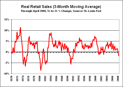 Nonetheless, the weakening employment circumstance is a strain on consumers, who account for more than 70% of GDP, when housing and personal consumption are included. In a related area, year-to-year inflation-adjusted growth in retail sales (smoothed with a three-month moving average), also has locked in a recession pattern. As shown in the preceding graph, the current level of annual contraction has not been seen historically outside of formal recessions, and the current contraction is the deepest since the 1990/1991 recession. When payrolls and retail sales show these patterns, a recession is in place.