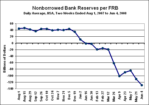 Banking System Stability Remains Elusive. Other than the hypesters on Wall Street, talk from central bankers and others knowledgeable within the system tend to confirm the continuing nature of the problems within the banking system. Direct evidence of ongoing trouble is seen in the increasing net lending of the Federal Reserve to troubled banks. The level of total nonborrowed reserves (a number that should be viewed on a not-seasonally-adjusted basis as to what is happening in the banking system) has continued to sink into record negative territory, a negative $129.3 ($130.3 adjusted) billion daily average for the two-week period ending June 4th, as shown in the following graph.