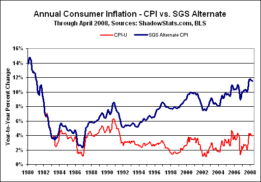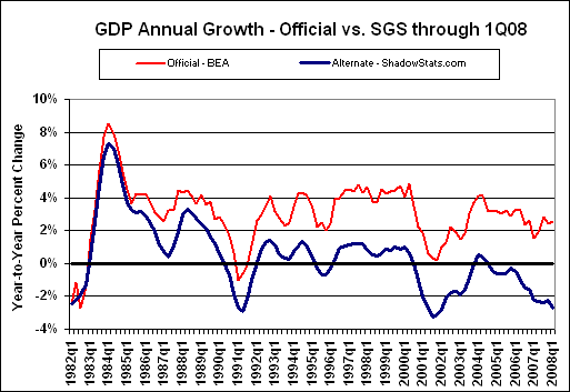 GDP. The alternate first-quarter 2008 GDP growth reflects the "preliminary" estimate revision, with many of the methodological gimmicks of recent decades removed. The alternate first-quarter inflation-adjusted annual growth rate (year-to-year, as opposed to the popularly-touted annualized quarter-to-quarter rate) for GDP was a decline of roughly 2.7% versus the official year-to-year gain of 2.5%. The official annualized real growth rate for the quarter was 0.9%. While the quarterly growth number is popularly followed, its significant inaccuracies are expanded to the fourth-power in reporting. The alternate measure safely would have shown a quarterly contraction.