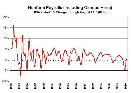 From peak-to-trough (the peak month was December 2007; December 2009 is current, but likely short-lived, trough of the current cycle), payroll employment declined by a seasonally-adjusted 8,363,000 jobs, or 6.1%. As of August 2010 reporting, net of temporary census hiring, payrolls have gained 0.5% or 639,000 jobs since the December 2009 trough.