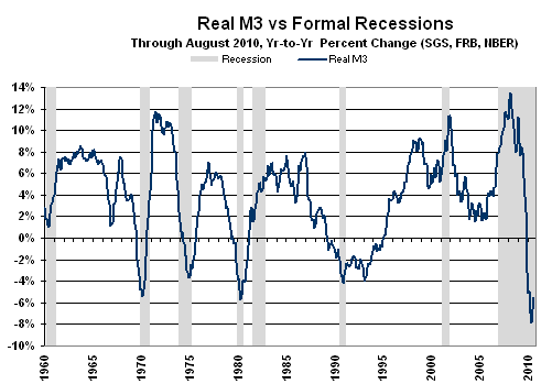 The following updated graph plots annual real M3 growth versus periods of recession formally recognized by the NBER. It includes approximate annual real contraction in the SGS Ongoing-M3 Estimate as of August 2010. The August M3 estimate used here is an annual real contraction of roughly 5.6% versus a 6.6% contraction in July. Details will be discussed in next week’s Special Commentary, which will include a review of the broad liquidity outlook and the money supply circumstance. The formal preliminary estimate for the SGS Ongoing M3 Measure for August will be posted this weekend of September 4th on the Alternate Data page for M3. At present, the pace of annual contraction in nominal August M3 is on track to hit 4.3%, versus 5.4% in July, reflecting a flattening/upturn in month-to-month change, with annual comparison against a pace of declining monthly growth in the year-ago period.