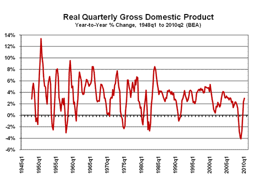 GDP. Published today (September 30th) by the BEA, the second revision, or third estimate, of second-quarter 2010 Gross Domestic Product (GDP) was a statistically-insignificant annualized real growth rate of 1.72% +/- 3% (95% confidence interval), up from the second estimate of 1.61%, but down from the "advance" estimate of 2.39%, and down from the estimated growth rate of 3.73% in the first-quarter. The year-to-year change in real second-quarter GDP revised to 3.00% from the first revision of 2.98%, and from initial reporting of 3.17%. Such was higher than the year-to-year 2.39% growth estimated for the first-quarter.